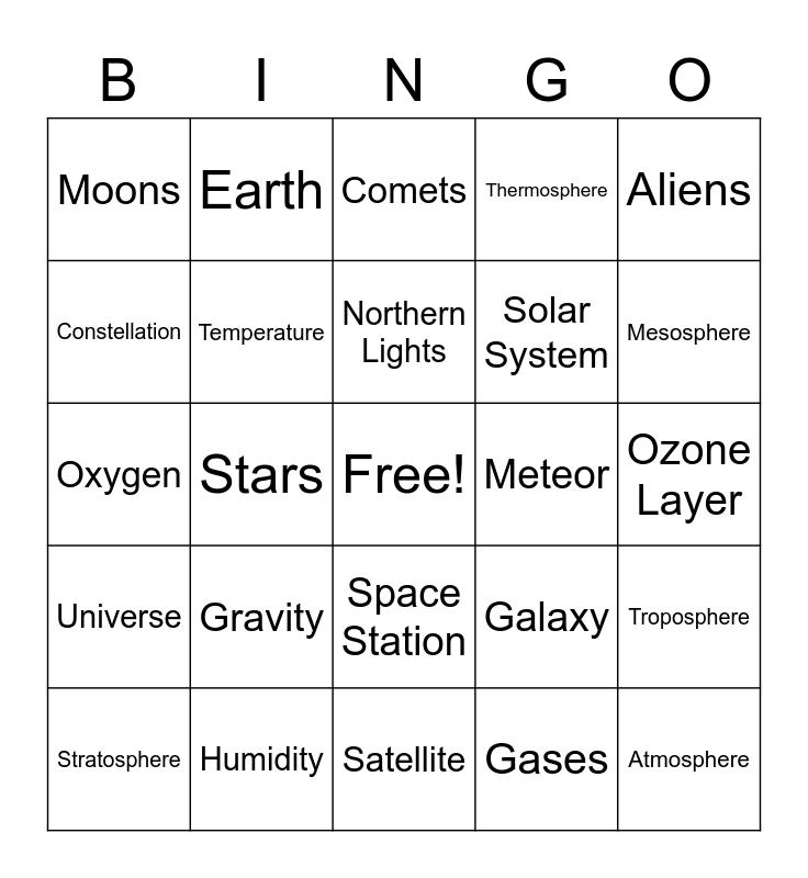 This bingo card has a free space and 24 words: Gravity, Humidity, Northern Lights, Stratosphere, Aliens, Moons, Constellation, Earth, Meteor, Space Station, Solar System, Oxygen, Galaxy, Troposphere, Temperature, Gases, Ozone Layer, Comets, Mesosphere, Stars, Atmosphere, Universe, Thermosphere and Satellite.