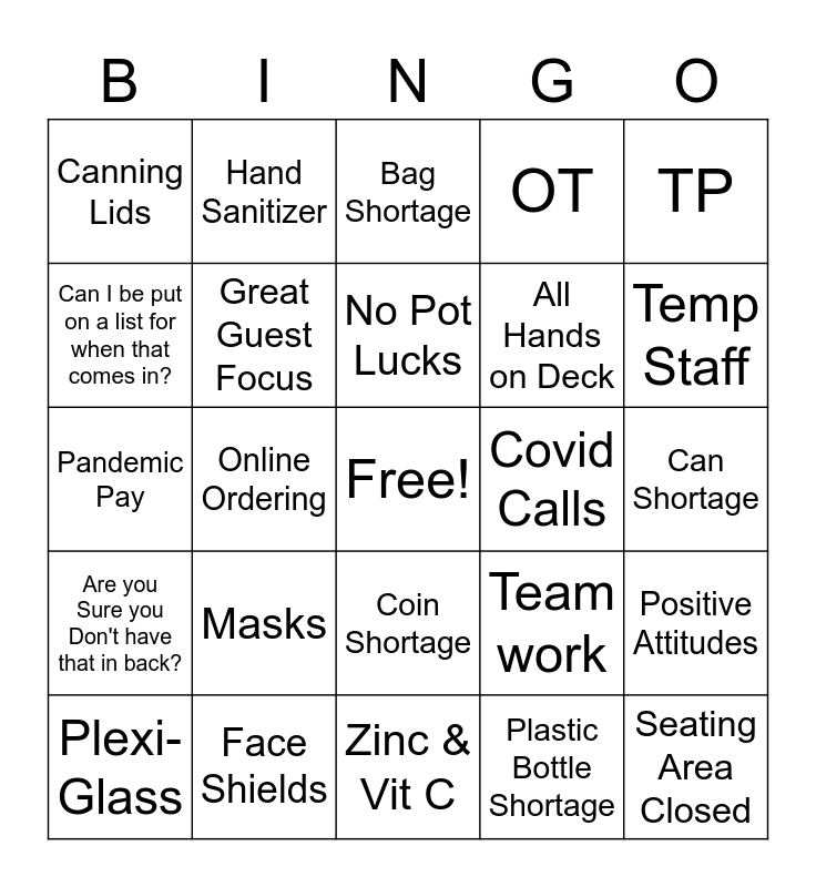 This bingo card has a free space and 24 words: Masks, Face Shields, No Pot Lucks, Plexi- Glass, TP, Canning Lids, Can I be put on a list for when that comes in?, Hand Sanitizer, Covid Calls, Coin Shortage, All Hands on Deck, Pandemic Pay, Team work, Positive Attitudes, Great Guest Focus, Plastic Bottle Shortage, Can Shortage, Bag Shortage, Temp Staff, Online Ordering, Seating Area Closed, Are you Sure you Don't have that in back?, OT and Zinc & Vit C.