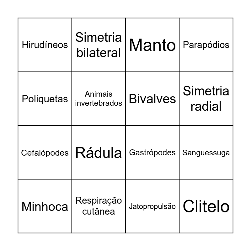 This bingo card has 24 words: Anelídeos, Oligoquetas, Simetria radial, Hermafrodita, Poliquetas, Hirudíneos, Animais invertebrados, Simetria bilateral, Respiração cutânea, Animais vertebrados, Cefalópodes, Gastrópodes, Cerdas, Concha, Bivalves, Moluscos, Jatopropulsão, Manto, Rádula, Sanguessuga, Minhoca, Clitelo, Parapódios and Saco visceral.