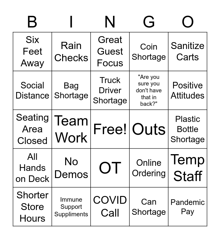 This bingo card has a free space and 24 words: No Demos, Immune Support Suppliments, Truck Driver Shortage, Shorter Store Hours, Sanitize Carts, Six Feet Away, Social Distance, Rain Checks, Outs, OT, "Are you sure you don't have that in back?", Seating Area Closed, Online Ordering, Temp Staff, Bag Shortage, Can Shortage, Plastic Bottle Shortage, Great Guest Focus, Positive Attitudes, Team Work, Pandemic Pay, All Hands on Deck, Coin Shortage and COVID Call.