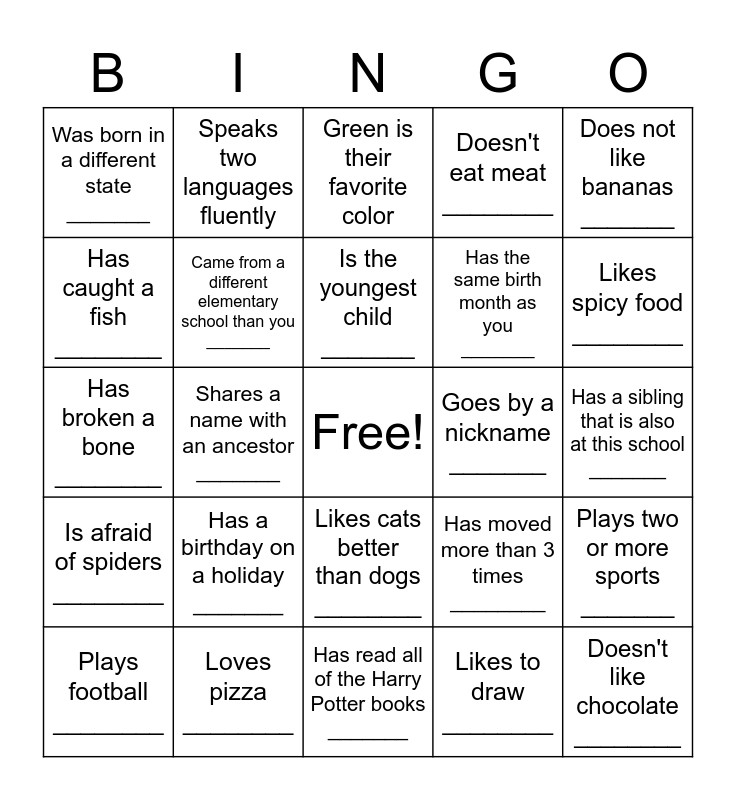 This bingo card has a free space and 24 words: Has a birthday on a holiday _______, Loves pizza ________, Is the youngest child _______, Plays football ________, Does not like bananas _______, Was born in a different state _______, Has caught a fish ________, Speaks two languages fluently, Goes by a nickname _______, Likes cats better than dogs ________, Has the same birth month as you _______, Has broken a bone ________, Has moved more than 3 times ________, Plays two or more sports _______, Came from a different elementary school than you _______, Likes to draw ________, Has a sibling that is also at this school _______, Green is their favorite color, Likes spicy food ________, Shares a name with an ancestor _______, Doesn't like chocolate ________, Is afraid of spiders ________, Doesn't eat meat ________ and Has read all of the Harry Potter books _______.