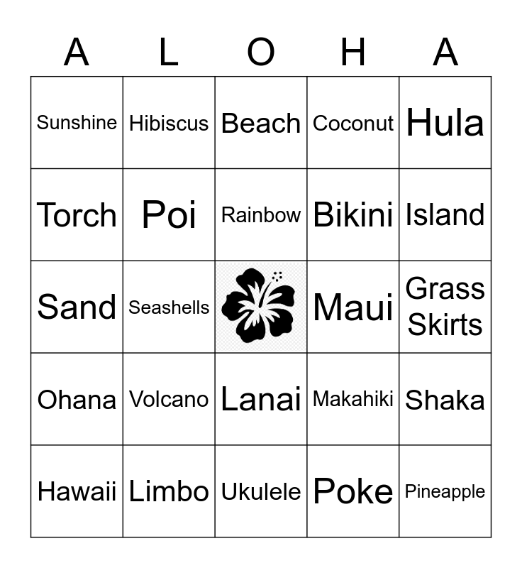 This bingo card has a free space and 44 words: Luau, Pineapple, King, Hawaii, Mahalo, Poke, Beach, Tiki, Hula, Limbo, Coconut, Maui, Lanai, Volcano, Kauai, Ukulele, Surfing, Sand, Tropical, Island, Hibiscus, Ocean, Waves, Sunshine, Lava, Grass Skirts, Honolulu, Mele Kalikimaka, Makahiki, Ohana, Heiau, Shaka, Honu, Nani, Seashells, Relaxation, Mai Tai, Suntan, Rainbow, Torch, Bikini, Sunset, Poi and Mahi Mahi.
