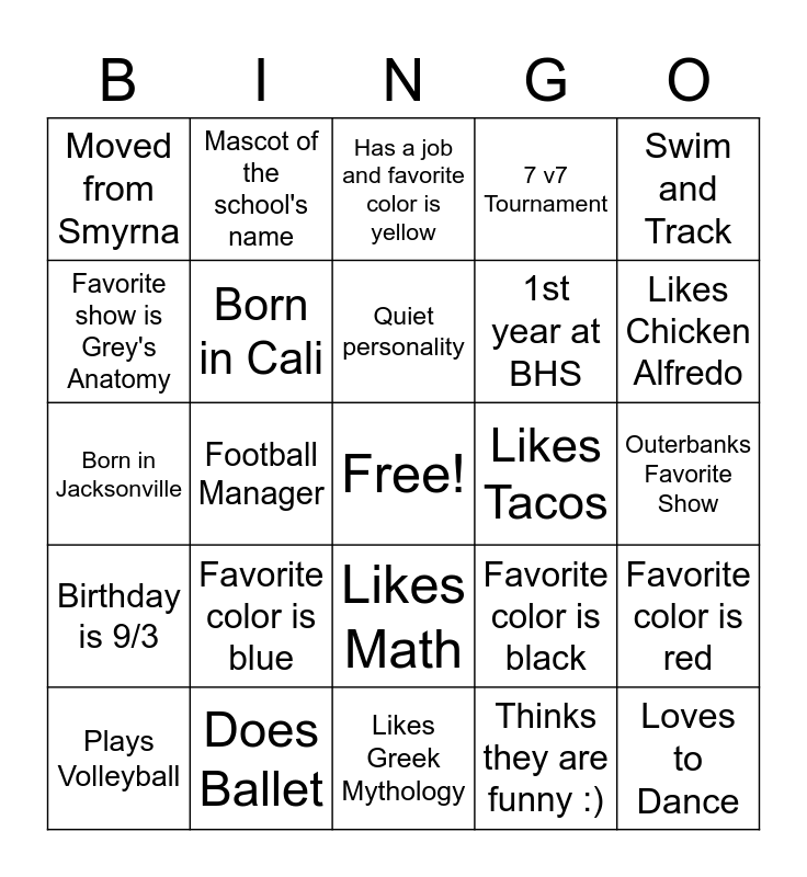 This bingo card has a free space and 29 words: Plays Volleyball, Favorite Color is Yellow, Football Manager, Plays Soccer, Moved from Smyrna, Has a job and favorite color is yellow, Born in Cali, Favorite color is blue, Likes Tacos, Does Ballet, Outerbanks Favorite Show, Loves to Dance, Likes Greek Mythology, Thinks they are funny :), Likes Chicken Alfredo, Is a Senior and likes Mexican food, Likes Math, Birthday is 9/3, Swim and Track, Born in Jacksonville, Favorite color is black, Works at Zaxby's, 1st year at BHS, Favorite show is Grey's Anatomy, 7 v7 Tournament, Mascot of the school's name, Favorite color is red, Quiet personality and What is the Principal's name?.