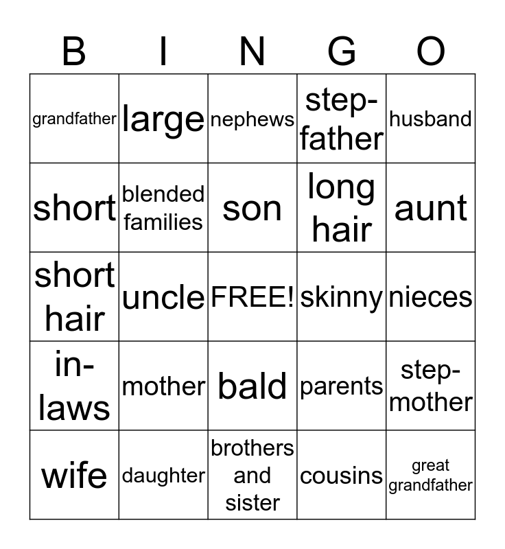 This bingo card has a free space and 24 words: mother, daughter, son, wife, husband, grandfather, short, large, skinny, bald, long hair, short hair, parents, step-mother, blended families, cousins, nieces, nephews, aunt, uncle, great grandfather, in-laws, step-father and brothers and sister.