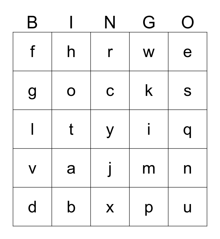 This bingo card has a free space and 24 words: a, b, c, d, e, f, g, h, i, j, k, l, m, n, o, p, q, r, s, t, u, v, w and x.