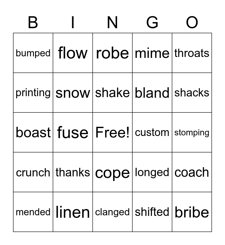 This bingo card has a free space and 24 words: thanks, linen, shake, mended, throats, bumped, printing, flow, custom, cope, bland, boast, longed, coach, snow, shifted, stomping, robe, shacks, fuse, bribe, crunch, mime and clanged.