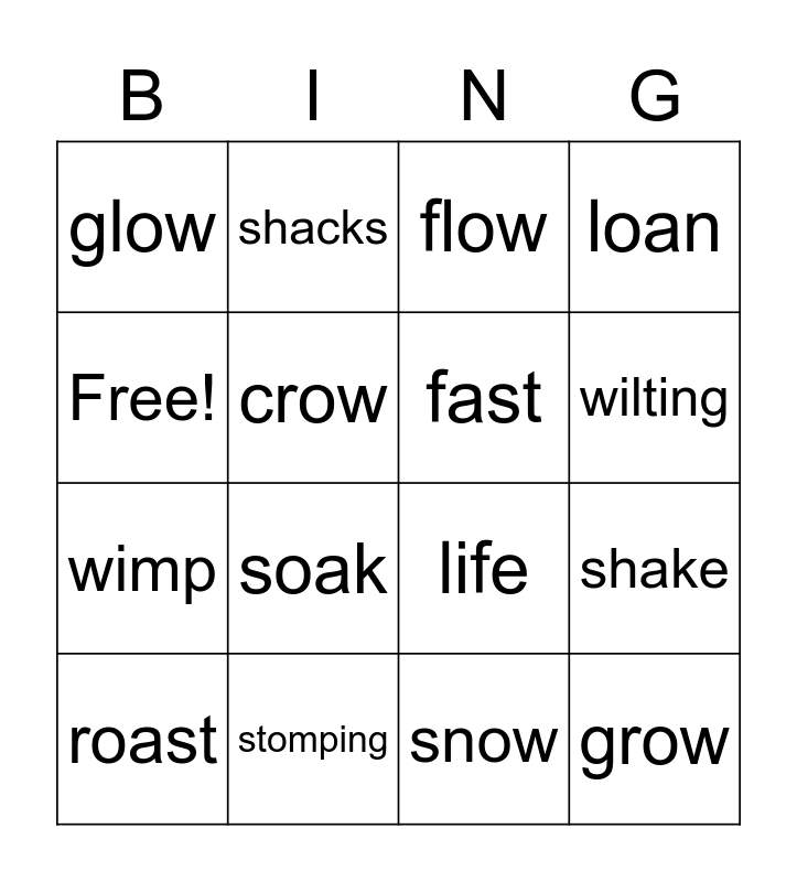 This bingo card has 16 words: stomping, shake, flow, glow, wimp, shacks, life, snow, Free!, crow, roast, loan, soak, wilting, fast and grow.