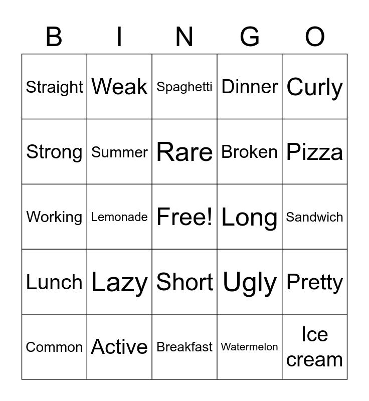 This bingo card has a free space and 24 words: Lazy, Active, Rare, Common, Curly, Straight, Strong, Weak, Long, Short, Broken, Working, Ugly, Pretty, Summer, Watermelon, Sandwich, Spaghetti, Pizza, Lemonade, Ice cream, Lunch, Dinner and Breakfast.