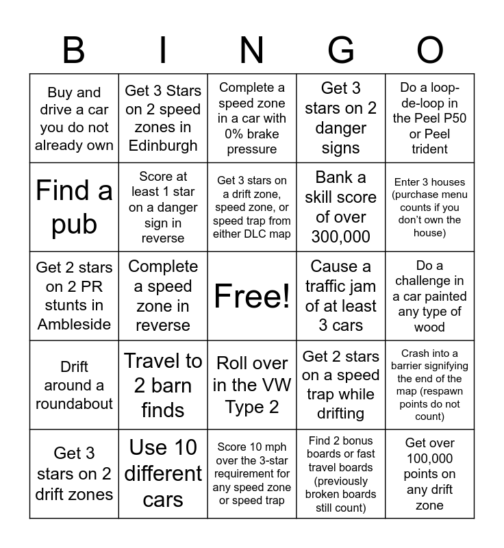 This bingo card has a free space and 50 words: Visit 2 Beauty Spots, Get over 100,000 points on any drift zone, Complete a lap of any circuit (don’t start a race), Score 10 mph over the 3-star requirement for any speed zone or speed trap, Travel to 2 barn finds, Get 3 Stars on 2 speed traps in Edinburgh, Get 3 Stars on 2 speed zones in Edinburgh, Travel to a castle, Find a pub, Complete a run of any drag strip, Score at least 1 star on a danger sign in reverse, Get 3 stars on 2 danger signs, Crash into a barrier signifying the end of the map (respawn points do not count), Get 2 stars on a speed trap while drifting, Do a barrel roll, Get 5 binman skills, Get 3 stars on a drift zone, speed zone, or speed trap from either DLC map, Cause a traffic jam of at least 3 cars, Complete any challenge in the Morgan 3-wheeler, Do a loop-de-loop in the Peel P50 or Peel trident, Complete a speed zone in reverse, Find 2 bonus boards or fast travel boards (previously broken boards still count), Buy and drive a car you do not already own, Bank a skill score of over 300,000, Get 2 stars on a PR stunt in the Mercedes-Benz Racing Truck, Mercedes-Benz Unimog, or Volvo Iron Knight, Drive the entire length of the freeway, Enter 3 houses (purchase menu counts if you don’t own the house), Catch over 5 seconds of air from anywhere except a danger sign, Complete a speed zone in a car with 0% brake pressure, Roll over in the VW Type 2, Cross the Derwent Reservoir twice, Complete a loop of the quarry, Crash into the train, Pop a wheelie, Use 10 different cars, Land a danger sign on your roof, Drive under 3 bridges, Cause another driver to crash, Honk your horn around all other contestants, Do a challenge in a car painted any type of wood, Park in a designated parking space, Reach a speed over 250mph, Park on top of a ramp in the quarry, Complete a dirt drift zone in any modern supercar, Get 3 stars on 2 drift zones, Get 2 stars on 2 PR stunts in Ambleside, Get 2 stars on 2 trailblazers, Take a photo of wildlife (birds and people do not count), Drift around a roundabout and Visit 2 playground games locations.