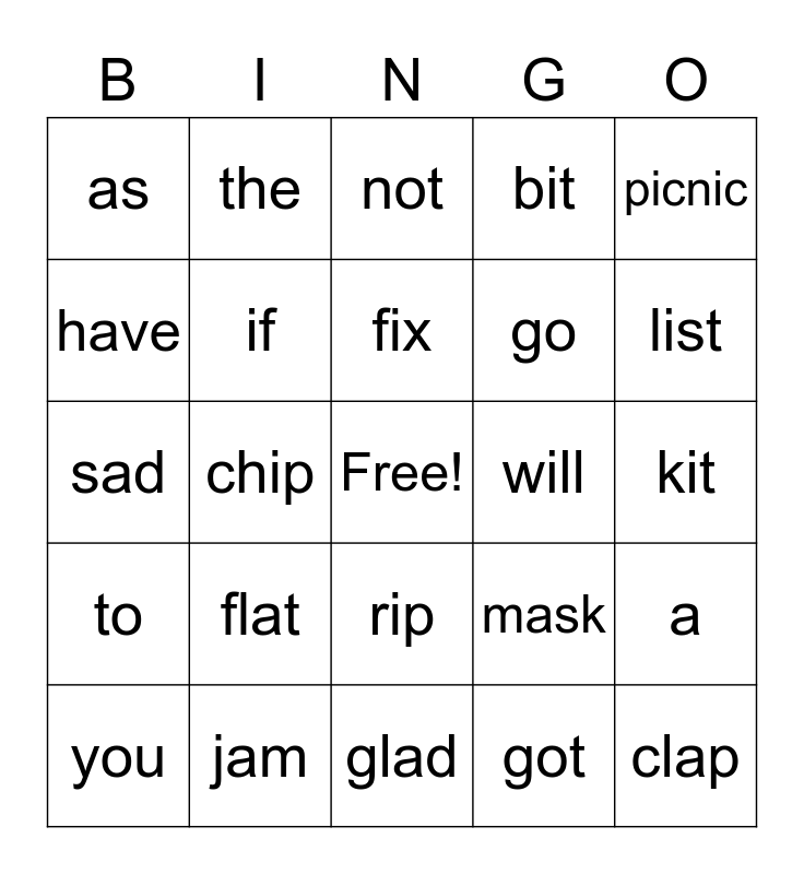 This bingo card has a free space and 28 words: a, and, go, got, have, not, the, to, will, you, sad, bit, jam, glad, list, win, flat, if, fix, rip, as, his, clap, chip, kit, mask, picnic and sandwich.