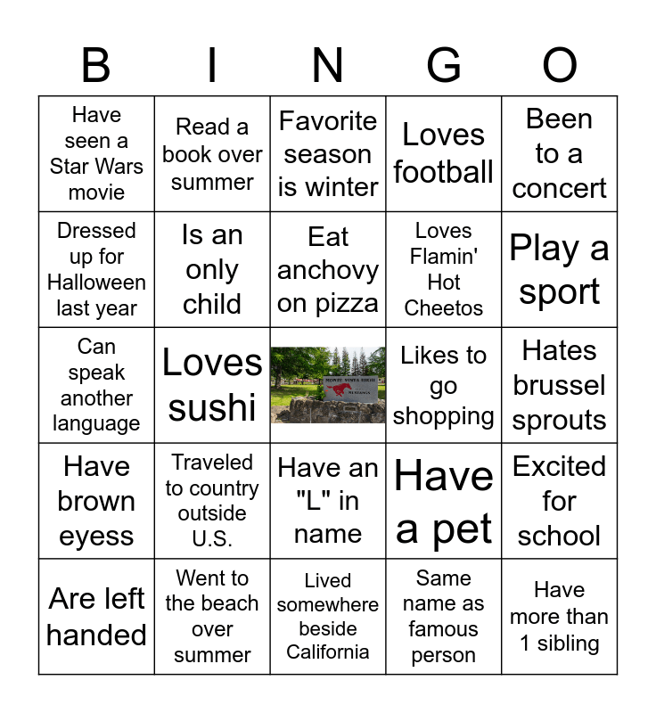 This bingo card has a free space and 29 words: Are left handed, Have broken a bone, Loves sushi, Took a long hike over summer, Have seen a Star Wars movie, Favorite season is winter, Is an only child, Traveled to country outside U.S., Likes to go shopping, Went to the beach over summer, Hates brussel sprouts, Have more than 1 sibling, Lived somewhere beside California, Same name as famous person, Play a sport, Seen a scary movie, Have an "L" in name, Have brown eyess, Been to a concert, Can speak another language, Have a pet, Can play an instrument, Loves Flamin' Hot Cheetos, Dressed up for Halloween last year, Loves football, Read a book over summer, Excited for school, Eat anchovy on pizza and Can finish "choices &...".