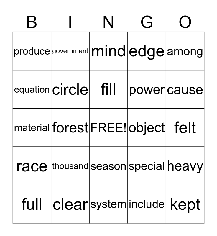 This bingo card has a free space and 24 words: thousand, clear, fill, full, among, produce, equation, government, object, season, power, material, special, heavy, circle, include, felt, mind, cause, forest, kept, race, edge and system.