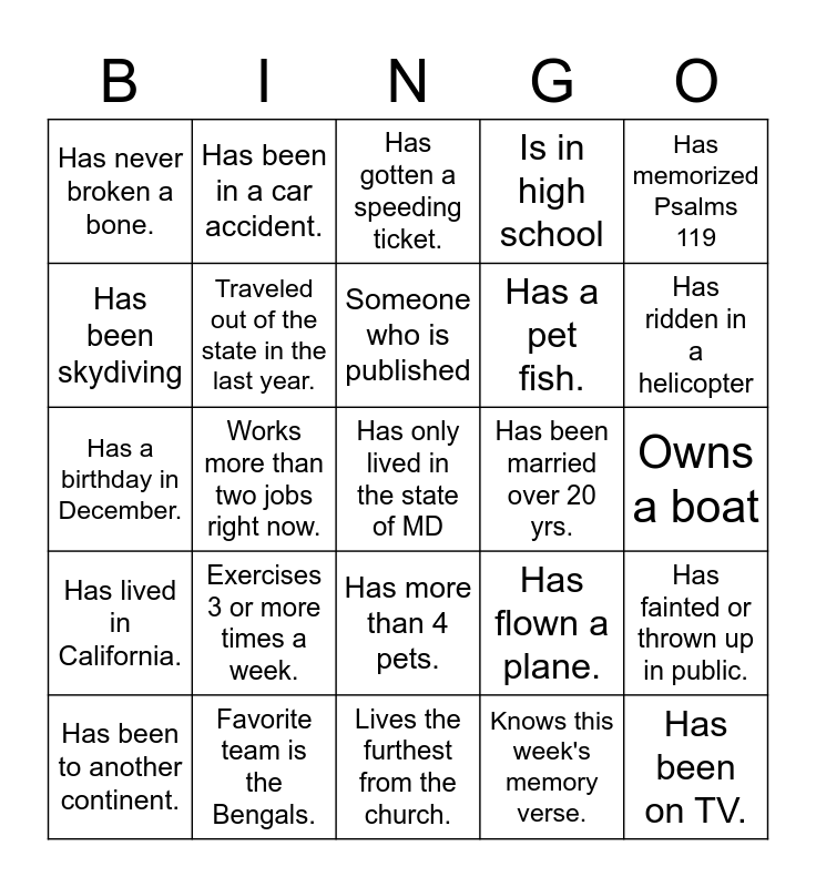 This bingo card has 46 words: Free!, Has only lived in the state of MD, Has had stitches, Lives the furthest from the church., Exercises 3 or more times a week., Was born in Colorado, Has been in a car accident., Favorite color is teal, Has been skydiving, Has never been in an airplane, Traveled out of the state in the last year., Is in high school, Has fainted or thrown up in public., Has flown a plane., Has been to a professional baseball game., Has a pet frog, Someone who is published, Has been married over 20 yrs., Is wearing green, Has memorized Psalms 119, Works more than two jobs right now., Knows this week's memory verse., Has never broken a bone., Has a pet fish., Has been to Mexico., Has ridden in a helicopter, Has been to another continent., Has been baptized., Has more than 4 pets., Has lived in California., Has never played Monopoly., Ate eggs for breakfast., Prayed for someone today., Hates pizza., Wears size 8 in shoes., Favorite team is the Bengals., Owns a boat, Walked at least a mile today., Has been to a funeral this year., Has jumped on a trampoline., Has been on TV., Has gotten a speeding ticket., Has a birthday in December., Is wearing cat socks., Has a red car. and Dislikes chocolate..