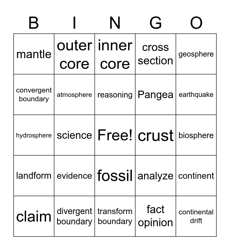 This bingo card has a free space and 24 words: claim, evidence, reasoning, fact opinion, geosphere, mantle, outer core, inner core, crust, biosphere, hydrosphere, atmosphere, analyze, continent, convergent boundary, divergent boundary, transform boundary, cross section, earthquake, landform, science, fossil, Pangea and continental drift.