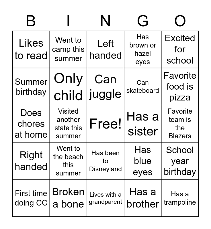 This bingo card has a free space and 29 words: First time doing CC, Has a pet, Visited another state this summer, Likes to play video games, Likes to read, Left handed, Only child, Went to the beach this summer, Has a sister, Broken a bone, Favorite team is the Blazers, Has a trampoline, Lives with a grandparent, Has a brother, Favorite food is pizza, Knows the Timeline Song, Has been to Disneyland, Right handed, Excited for school, Does chores at home, Has blue eyes, Favorite subject is science, Can skateboard, Summer birthday, Has brown or hazel eyes, Went to camp this summer, School year birthday, Can juggle and Been outside the country.