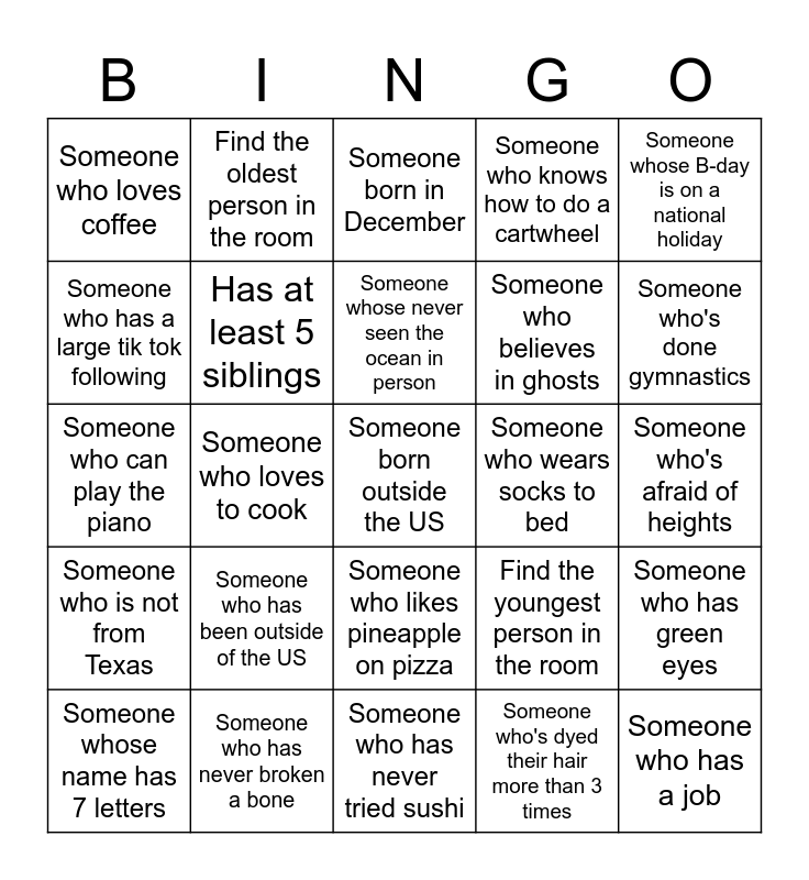 This bingo card has a free space and 24 words: Someone who has been outside of the US, Someone who has never broken a bone, Someone whose never seen the ocean in person, Someone whose name has 7 letters, Someone whose B-day is on a national holiday, Someone who loves coffee, Someone who has a large tik tok following, Find the oldest person in the room, Someone who wears socks to bed, Someone who likes pineapple on pizza, Someone who believes in ghosts, Someone who can play the piano, Find the youngest person in the room, Someone who has green eyes, Has at least 5 siblings, Someone who's dyed their hair more than 3 times, Someone who's afraid of heights, Someone born in December, Someone who's done gymnastics, Someone who loves to cook, Someone who has a job, Someone who is not from Texas, Someone who knows how to do a cartwheel and Someone who has never tried sushi.