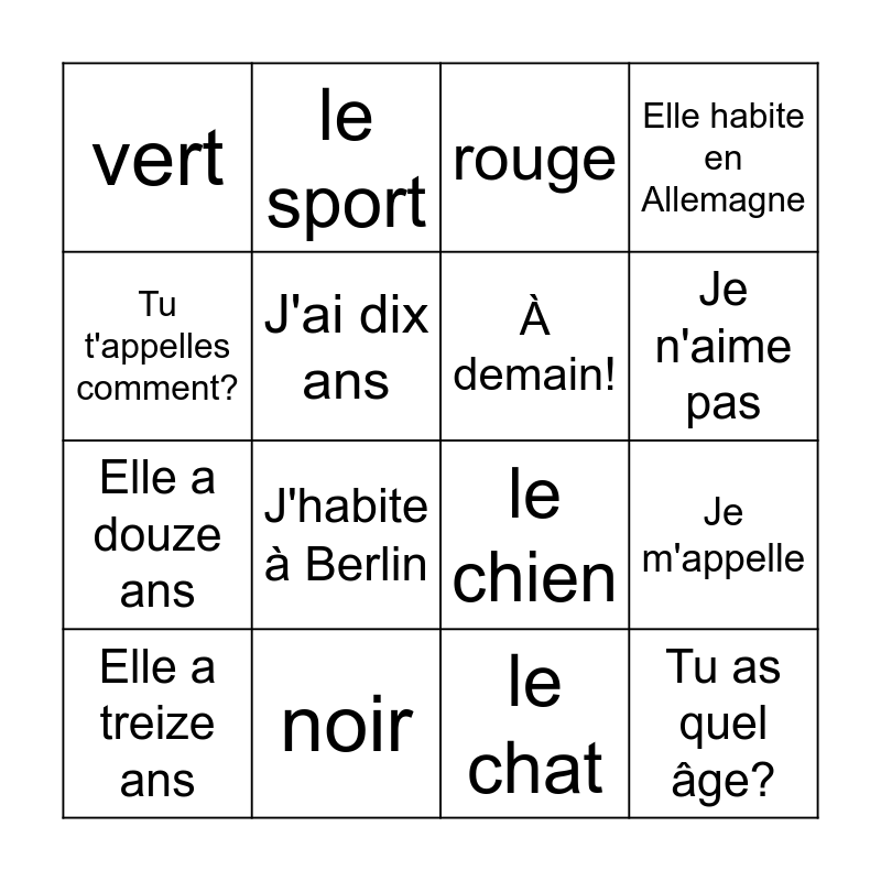 This bingo card has 16 words: noir, Je m'appelle, rouge, vert, Elle a douze ans, le sport, le chien, le chat, Tu t'appelles comment?, J'ai dix ans, Elle a treize ans, Elle habite en Allemagne, J'habite à Berlin, Je n'aime pas, À demain! and Tu as quel âge?.
