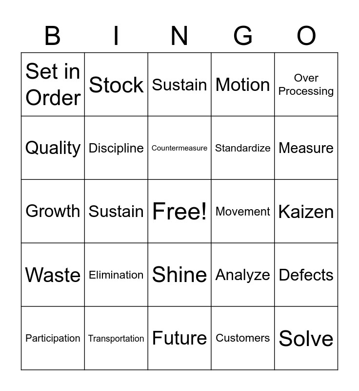 This bingo card has a free space and 70 words: 5S, Kaizen, 7 Waste, Continuous Improvement, Transportation, Inventory, Motion, Waiting, Over Processing, Over Production, Defects, Sort, Set in Order, Sustain, Shine, Sustain, Shine, Standardize, Value, Waste, Movement, Analyze, Measure, Flow Diagram, Cause, Effect, Productivity, Storage, Customers, Layout, Stock, Change, Good, Progress, Contribution, Engage, Knowledge, Share, Teach, Quality, Lean, Elimination, Solve, Unorganized, Abnormalities, Discipline, Participation, Habit, Assembly, Problem, Planning, Celebrate, Results, Team, Future, Redesign, Countermeasure, Define, System, Japan, Growth, Pull, Push, Ideas, Concerns, Workflow, Cost, Efficiency, Overhead and Categorize.