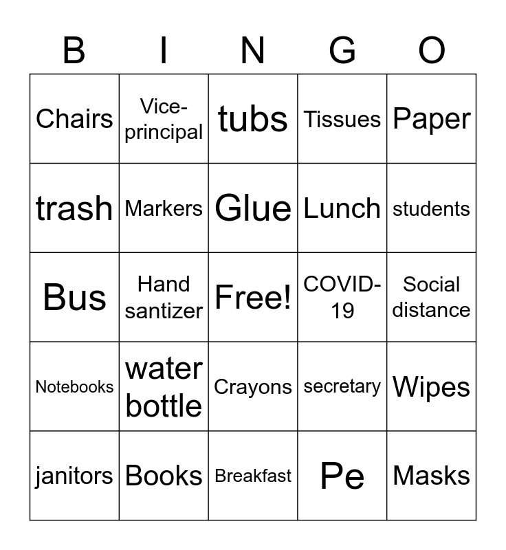 This bingo card has a free space and 41 words: School, Bus, Pencils, Markers, Books, Crayons, Glue, Scissors, Paper, Notebooks, Hand santizer, Tissues, Masks, Social distance, COVID-19, water bottle, Booksack, Chairs, Tables, tubs, Wipes, disinfectant, Breakfast, Lunch, Pullouts, Dismissal, Pe, library, students, Teachers, Principal, Vice-principal, janitors, Cafeteria, secretary, trash, Computers, whiteboards, printers, planner and LIM.