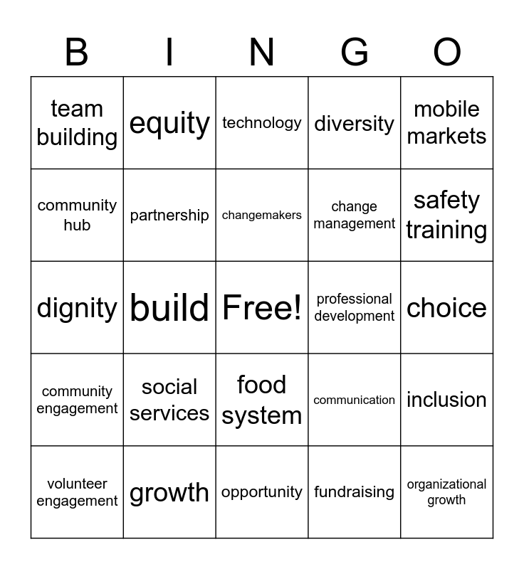 This bingo card has a free space and 25 words: social services, opportunity, changemakers, volunteer engagement, mobile markets, team building, community hub, equity, professional development, food system, change management, dignity, communication, inclusion, partnership, food rescue, choice, technology, safety training, build, organizational growth, growth, community engagement, diversity and fundraising.