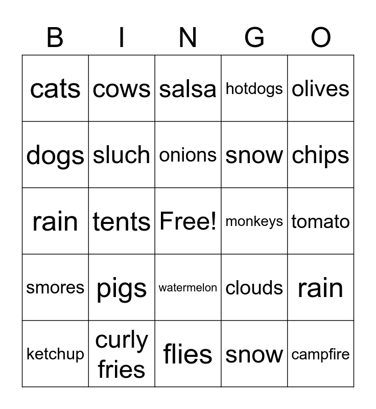This bingo card has a free space and 24 words: pigs, curly fries, onions, ketchup, olives, cats, dogs, cows, monkeys, watermelon, snow, rain, clouds, rain, sluch, snow, tomato, salsa, chips, tents, campfire, smores, hotdogs and flies.