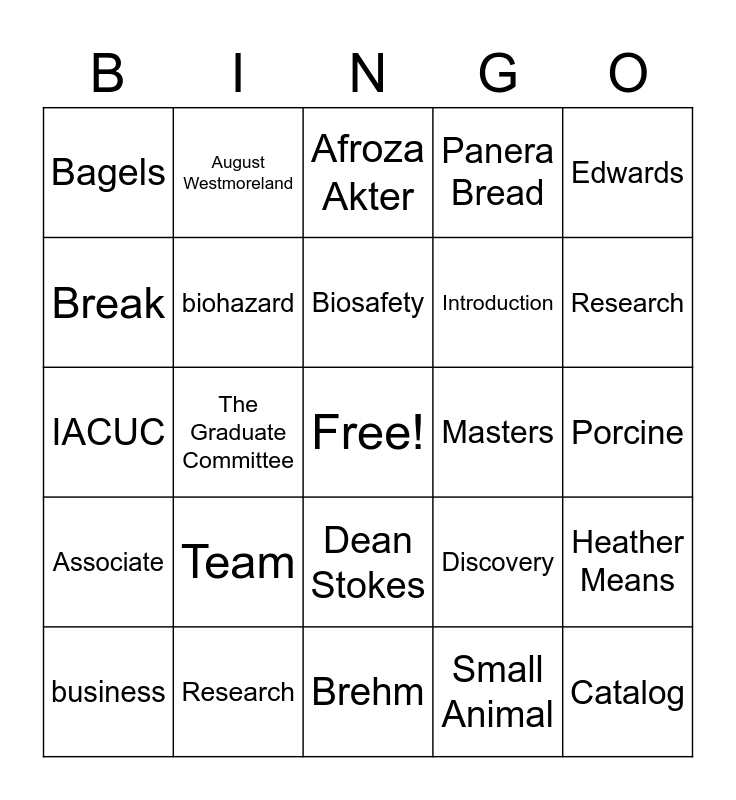 This bingo card has a free space and 79 words: Animal Science, Schneider, Afroza Akter, Cattle, Scholarly, Collegial, Helpful, Receptive, Independent, Critical, Coffee, Pizza, Panera Bread, Bagels, Water, Break, Icebreaker, Team, Horses, Porcine, Schrick, Edwards, IACUC, Biosafety, biohazard, Gene Wilder, Austin Powers, Travel, Laboratory, “Again”, Research, “to that end”, Brehm, Mask, business, Masters, Website, Handbook, Fescue, Catalog, Travel Request, Conference, Corpus Luteum, Tofu, Egg, August Westmoreland, Sperm, IRIS, ASGSA, Myer, Heather Means, The Graduate Committee, Discovery, PhD, Committee, Undergraduate, Shelley Johnson, Dean Beyl, Dean Xin, Dean Stokes, Introduction, ANSC 696, ANSC 515, Whistleblower, Student, Faculty, Mentor, Professor, Adjunct, Associate, Research, Teaching, Extension, Veterinary, Large Animal, Small Animal, Compliance, Vertebrate and Dr. Hauser.