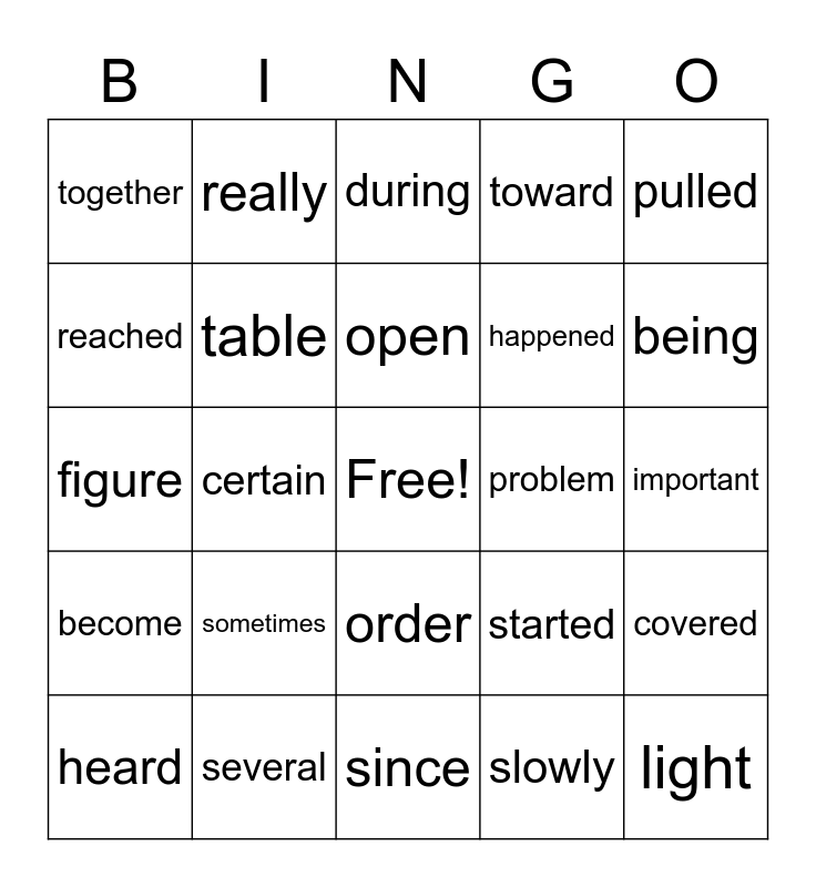 This bingo card has a free space and 25 words: sometimes, since, open, heard, pulled, together, reached, really, problem, order, happened, figure, started, covered, table, complete, important, during, being, certain, light, several, become, toward and slowly.