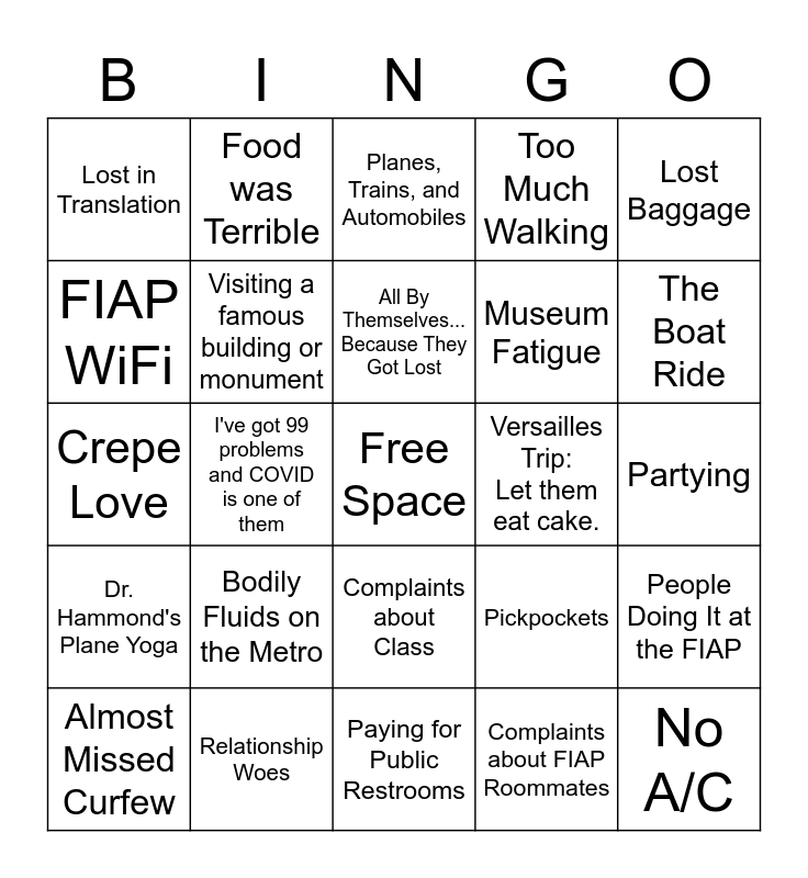 This bingo card has a free space and 24 words: Bodily Fluids on the Metro, Relationship Woes, All By Themselves... Because They Got Lost, Almost Missed Curfew, Lost Baggage, Lost in Translation, FIAP WiFi, Food was Terrible, Versailles Trip: Let them eat cake., Complaints about Class, Museum Fatigue, Crepe Love, Pickpockets, People Doing It at the FIAP, Visiting a famous building or monument, Complaints about FIAP Roommates, Partying, Planes, Trains, and Automobiles, The Boat Ride, I've got 99 problems and COVID is one of them, No A/C, Dr. Hammond's Plane Yoga, Too Much Walking and Paying for Public Restrooms.