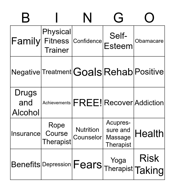 This bingo card has a free space and 24 words: Rope Course Therapist, Depression, Goals, Benefits, Obamacare, Family, Negative, Physical Fitness Trainer, Recover, Nutrition Counselor, Rehab, Drugs and Alcohol, Acupres-sure and Massage Therapist, Health, Treatment, Yoga Therapist, Addiction, Confidence, Positive, Achievements, Risk Taking, Insurance, Self-Esteem and Fears.