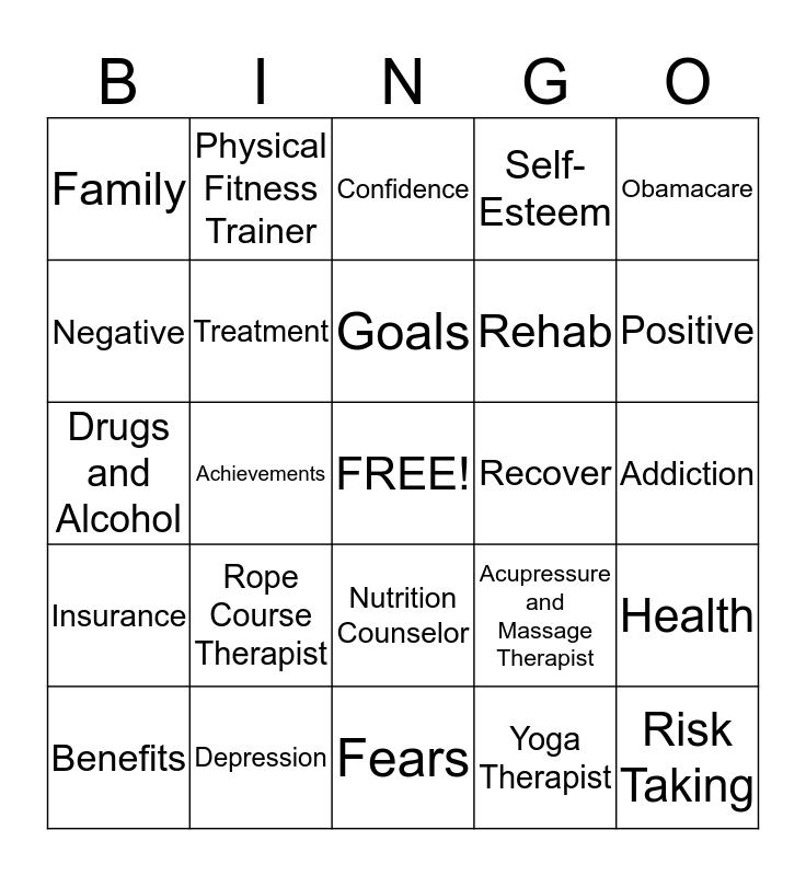 This bingo card has a free space and 24 words: Rope Course Therapist, Depression, Goals, Benefits, Obamacare, Family, Negative, Physical Fitness Trainer, Recover, Nutrition Counselor, Rehab, Drugs and Alcohol, Acupressure and Massage Therapist, Health, Treatment, Yoga Therapist, Addiction, Confidence, Positive, Achievements, Risk Taking, Insurance, Self-Esteem and Fears.