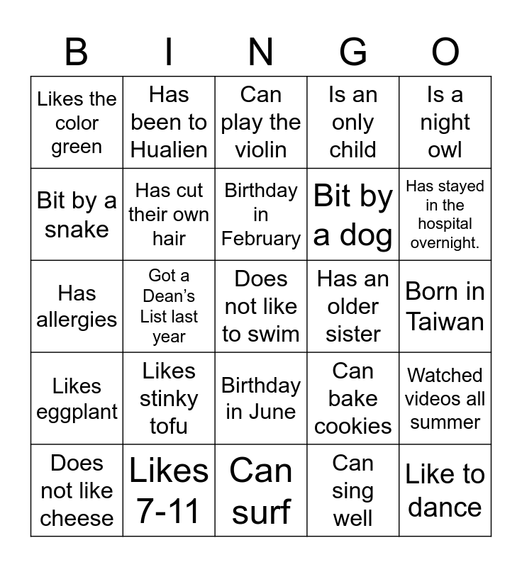 This bingo card has 44 words: Free!, Does not like to swim, Is older than me, Does not like cheese, Has never been to Japan, Can sing well, Can play the violin, Is a morning person, Is a night owl, Likes 7-11, Is an only child, Has an older sister, Birthday in June, Likes stinky tofu, Slept in a class (when you weren’t supposed to), Can surf, Has seen the Atlantic Ocean, Has allergies, Has been to Disneyland, Has stayed in the hospital overnight., Has been to Hualien, 14 years old, Can play chess (western or eastern), Likes the color green, Has a pet fish, Born in Taiwan, Has been to Korea, Can speak more than 2 languages, Can bake cookies, Likes eggplant, Loves Cheese, Watched videos all summer, Likes the color yellow, Has never had detention, Got a Dean’s List last year, Traveled overseas summer vacation, Done someone else’s homework for them, Like to dance, Birthday in February, Bit by a snake, Bit by a dog, Can play baseball (well), Has cut their own hair and Is Canadian.