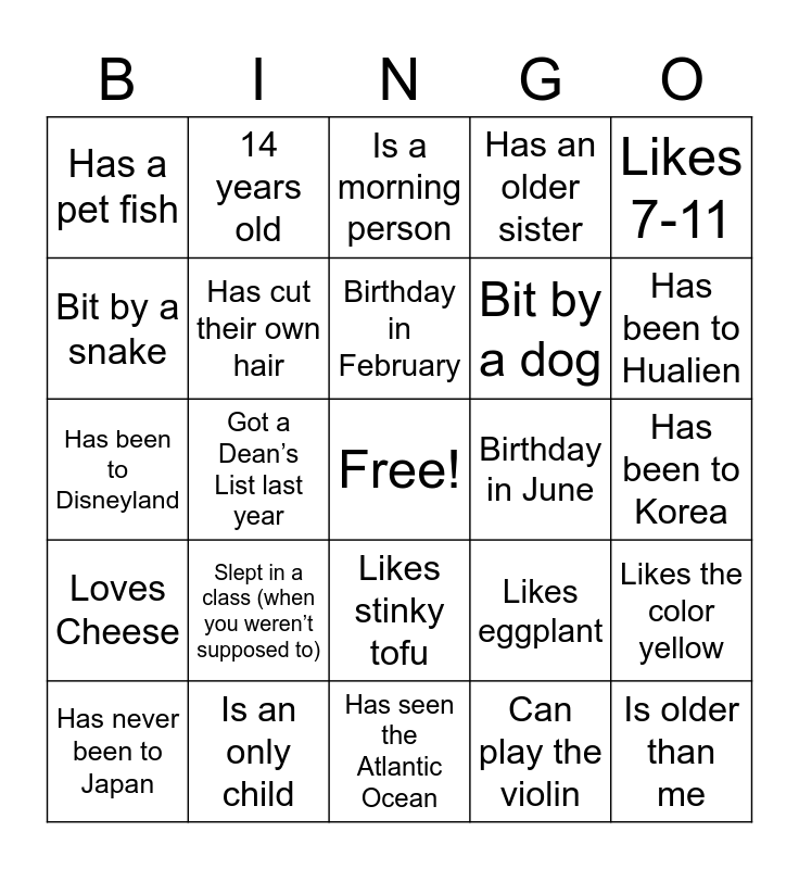 This bingo card has a free space and 43 words: Does not like to swim, Is older than me, Does not like cheese, Has never been to Japan, Can sing well, Can play the violin, Is a morning person, Is a night owl, Likes 7-11, Is an only child, Has an older sister, Birthday in June, Likes stinky tofu, Slept in a class (when you weren’t supposed to), Can surf, Has seen the Atlantic Ocean, Has allergies, Has been to Disneyland, Has stayed in the hospital overnight., Has been to Hualien, 14 years old, Can play chess (western or eastern), Likes the color green, Has a pet fish, Born in Taiwan, Has been to Korea, Can speak more than 2 languages, Can bake cookies, Likes eggplant, Loves Cheese, Watched videos all summer, Likes the color yellow, Has never had detention, Got a Dean’s List last year, Traveled overseas summer vacation, Done someone else’s homework for them, Like to dance, Birthday in February, Bit by a snake, Bit by a dog, Can play baseball (well), Has cut their own hair and Is Canadian.
