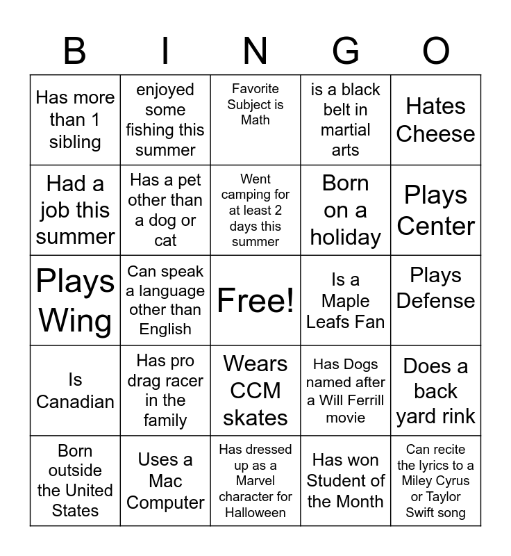 This bingo card has a free space and 29 words: Born outside the United States, Is a Goalie, Can speak a language other than English, Runs an apparel company, Has more than 1 sibling, Favorite Subject is Math, Has a pet other than a dog or cat, Has pro drag racer in the family, Is a Maple Leafs Fan, Uses a Mac Computer, Plays Defense, Can recite the lyrics to a Miley Cyrus or Taylor Swift song, Has dressed up as a Marvel character for Halloween, Has won Student of the Month, Plays Center, Has lived in a different State, Wears CCM skates, Is Canadian, Hates Cheese, Plays Wing, Has Dogs named after a Will Ferrill movie, Has broken a bone, Born on a holiday, Had a job this summer, is a black belt in martial arts, enjoyed some fishing this summer, Does a back yard rink, Went camping for at least 2 days this summer and Does their own laundry.