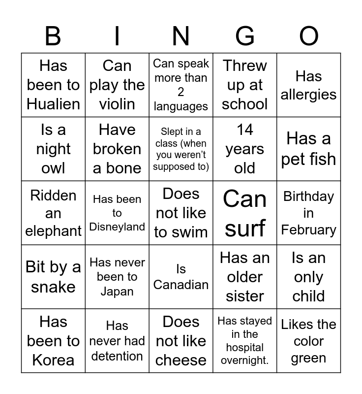 This bingo card has 51 words: Free!, Does not like to swim, Is older than me, Does not like cheese, Has never been to Japan, Can sing well, Can play the violin, Is a morning person, Is a night owl, Likes 7-11, Have broken a bone, Threw up at school, Is an only child, Has an older sister, Birthday in June, Likes stinky tofu, Slept in a class (when you weren’t supposed to), Can surf, Has seen the Atlantic Ocean, Has allergies, Has been to Disneyland, Has stayed in the hospital overnight., Has been to Hualien, 14 years old, Can play chess (western or eastern), Likes the color green, Has a pet fish, Born in Taiwan, Has been to Korea, Can speak more than 2 languages, Can bake cookies, Likes eggplant, Loves Cheese, Watched videos all summer, Likes the color yellow, Has never had detention, Got a Dean’s List last year, Traveled overseas summer vacation, Done someone else’s homework for them, Like to dance, Birthday in February, Bit by a snake, Bit by a dog, Never seen snow, Eaten a bug, Ridden a horse, Ridden an elephant, Can play baseball (well), Has cut their own hair, Is Canadian and Fallen out of bed.