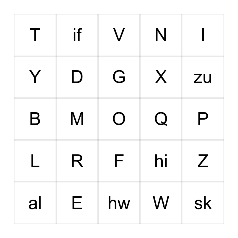 This bingo card has 40 words: A, B, C, D, E, F, G, H, I, L, M, N, O, P, Q, R, S, T, U, V, Z, W, X, Y, J, ab, cd, de, sk, mc, ie, al, fg, hi, zu, hw, oa, er, if and ig.