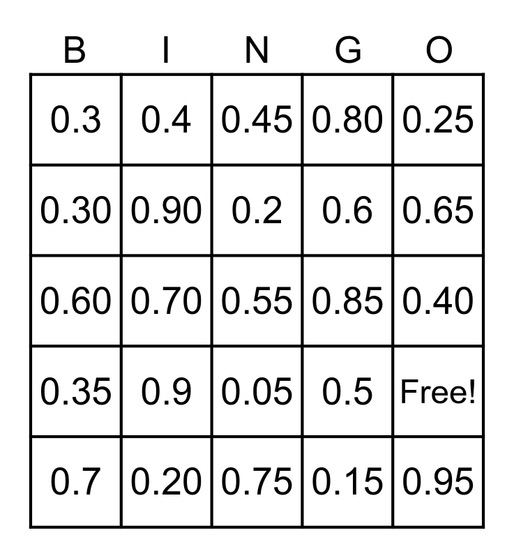 This bingo card has 26 words: 0.05, 0.15, 0.2, 0.20, 0.25, 0.3, 0.30, 0.4, 0.40, 0.5, 0.6, 0.60, Free!, 0.7, 0.70, 0.8, 0.80, 0.35, 0.45, 0.55, 0.65, 0.75, 0.85, 0.9, 0.90 and 0.95.