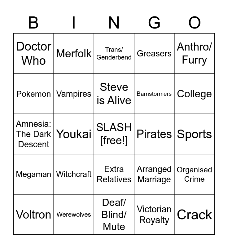 This bingo card has a free space and 24 words: Voltron, Witchcraft, Steve is Alive, Victorian Royalty, Anthro/ Furry, Doctor Who, Merfolk, Trans/ Genderbend, Pirates, Sports, Amnesia: The Dark Descent, Vampires, Arranged Marriage, Organised Crime, Pokemon, Werewolves, Deaf/ Blind/ Mute, Greasers, College, Megaman, Youkai, Extra Relatives, Barnstormers and Crack.