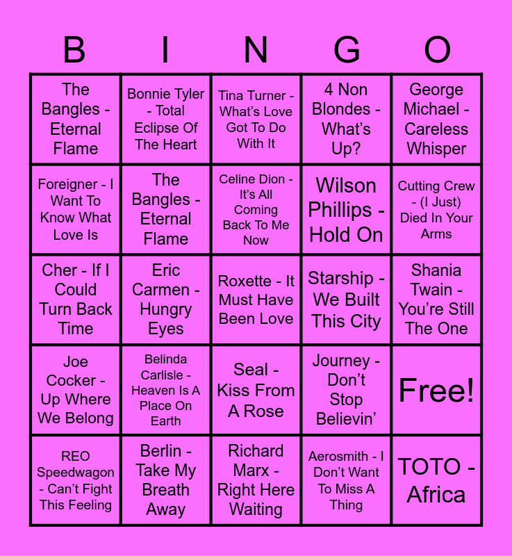 This bingo card has 26 words: Seal - Kiss From A Rose, Aerosmith - I Don’t Want To Miss A Thing, Celine Dion - It’s All Coming Back To Me Now, Berlin - Take My Breath Away, George Michael - Careless Whisper, The Bangles - Eternal Flame, Foreigner - I Want To Know What Love Is, Bonnie Tyler - Total Eclipse Of The Heart, Shania Twain - You’re Still The One, Journey - Don’t Stop Believin’, Wilson Phillips - Hold On, Cher - If I Could Turn Back Time, Free!, REO Speedwagon - Can’t Fight This Feeling, Eric Carmen - Hungry Eyes, Meat Loaf - I’d Do Anything For Love, 4 Non Blondes - What’s Up?, Joe Cocker - Up Where We Belong, Tina Turner - What’s Love Got To Do With It, Roxette - It Must Have Been Love, Cutting Crew - (I Just) Died In Your Arms, Richard Marx - Right Here Waiting, Starship - We Built This City, Belinda Carlisle - Heaven Is A Place On Earth, The Bangles - Eternal Flame and TOTO - Africa.