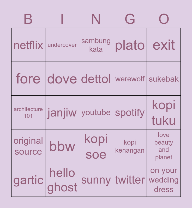 This bingo card has a free space and 24 words: bbw, hello ghost, dettol, gartic, exit, netflix, fore, undercover, spotify, kopi soe, werewolf, architecture 101, kopi kenangan, love beauty and planet, dove, twitter, kopi tuku, sambung kata, sukebak, janjiw, on your wedding dress, original source, plato and sunny.
