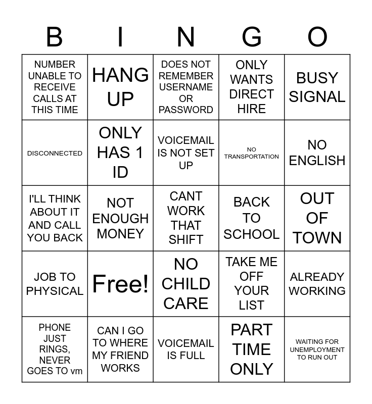 This bingo card has 25 words: Free!, VOICEMAIL IS FULL, VOICEMAIL IS NOT SET UP, PHONE JUST RINGS, NEVER GOES TO vm, BUSY SIGNAL, NUMBER UNABLE TO RECEIVE CALLS AT THIS TIME, DISCONNECTED, HANG UP, BACK TO SCHOOL, NO CHILD CARE, NO TRANSPORTATION, I'LL THINK ABOUT IT AND CALL YOU BACK, TAKE ME OFF YOUR LIST, ALREADY WORKING, ONLY HAS 1 ID, WAITING FOR UNEMPLOYMENT TO RUN OUT, OUT OF TOWN, DOES NOT REMEMBER USERNAME OR PASSWORD, NO ENGLISH, NOT ENOUGH MONEY, CANT WORK THAT SHIFT, CAN I GO TO WHERE MY FRIEND WORKS, JOB TO PHYSICAL, ONLY WANTS DIRECT HIRE and PART TIME ONLY.