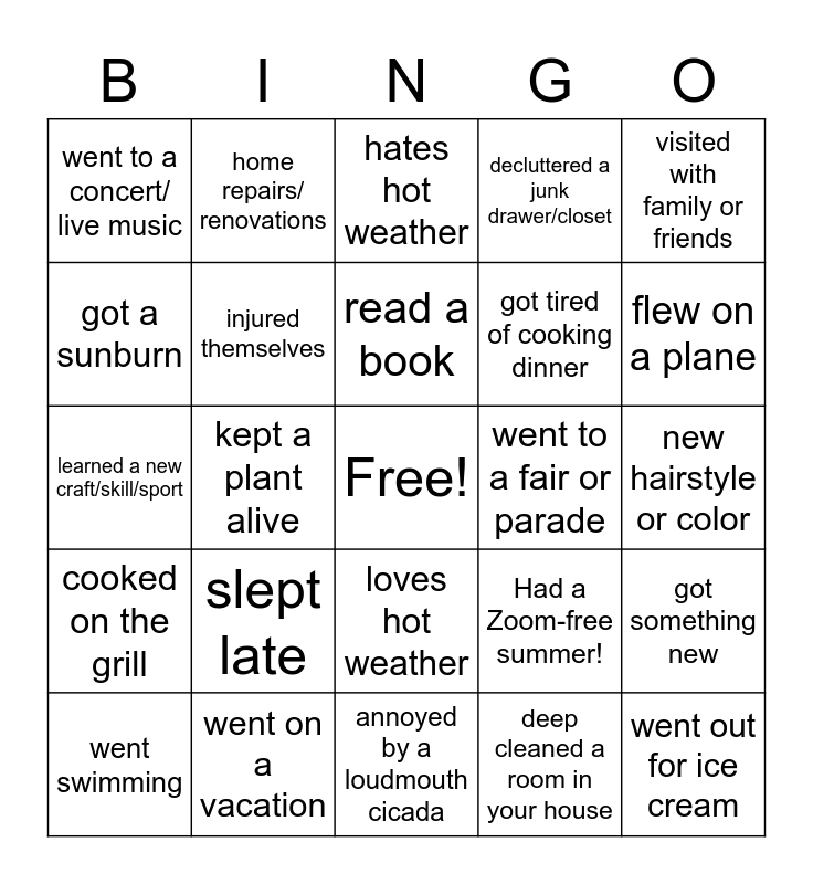 This bingo card has a free space and 24 words: slept late, went on a vacation, read a book, went swimming, visited with family or friends, went to a concert/ live music, got a sunburn, home repairs/ renovations, went to a fair or parade, loves hot weather, got tired of cooking dinner, learned a new craft/skill/sport, Had a Zoom-free summer!, got something new, injured themselves, deep cleaned a room in your house, new hairstyle or color, hates hot weather, flew on a plane, kept a plant alive, went out for ice cream, cooked on the grill, decluttered a junk drawer/closet and annoyed by a loudmouth cicada.