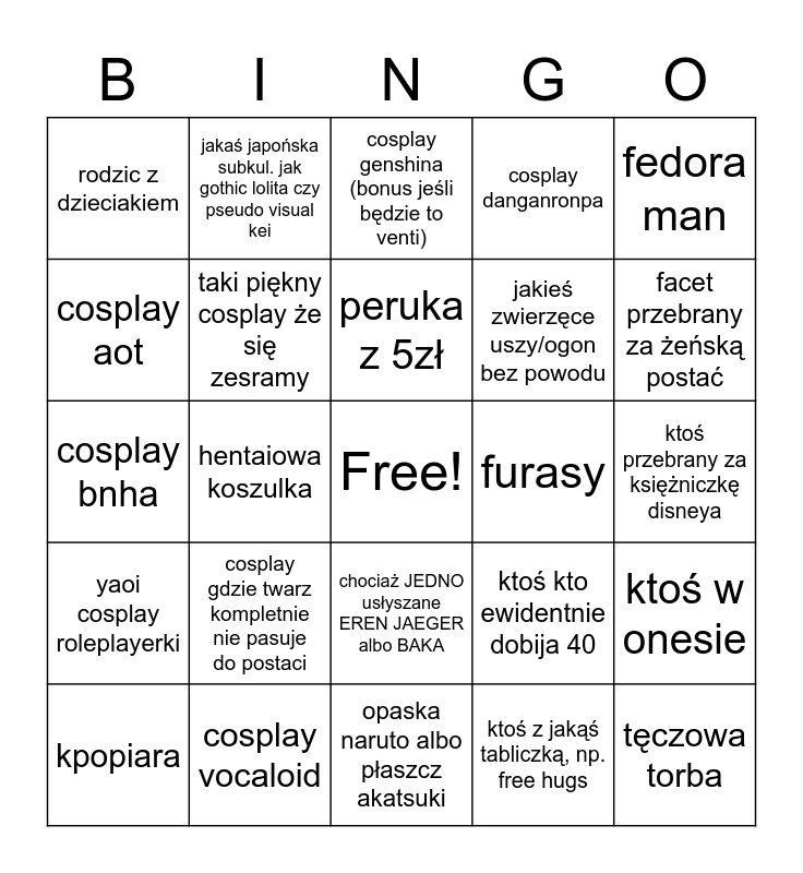 This bingo card has a free space and 24 words: cosplay gdzie twarz kompletnie nie pasuje do postaci, cosplay vocaloid, peruka z 5zł, kpopiara, fedora man, rodzic z dzieciakiem, cosplay aot, jakaś japońska subkul. jak gothic lolita czy pseudo visual kei, furasy, chociaż JEDNO usłyszane EREN JAEGER albo BAKA, jakieś zwierzęce uszy/ogon bez powodu, cosplay bnha, ktoś kto ewidentnie dobija 40, ktoś w onesie, taki piękny cosplay że się zesramy, ktoś z jakąś tabliczką, np. free hugs, ktoś przebrany za księżniczkę disneya, cosplay genshina (bonus jeśli będzie to venti), facet przebrany za żeńską postać, hentaiowa koszulka, tęczowa torba, yaoi cosplay roleplayerki, cosplay danganronpa and opaska naruto albo płaszcz akatsuki.