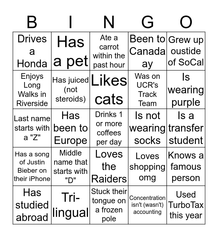 This bingo card has a free space and 24 words: Middle name that starts with "D", Tri-lingual, Likes cats, Has studied abroad, Grew up oustide of SoCal, Drives a Honda, Enjoys Long Walks in Riverside, Has a pet, Is not wearing socks, Loves the Raiders, Was on UCR's Track Team, Last name starts with a "Z", Loves shopping omg, Knows a famous person, Has juiced (not steroids), Concentration isn't (wasn't) accounting, Is a transfer student, Ate a carrot within the past hour, Is wearing purple, Has been to Europe, Used TurboTax this year, Has a song of Justin Bieber on their iPhone, Been to Canada ay and Stuck their tongue on a frozen pole.