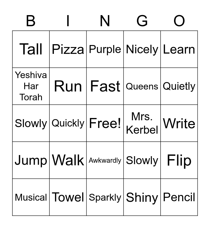 This bingo card has a free space and 25 words: Walk, Sparkly, Fast, Musical, Learn, Tall, Yeshiva Har Torah, Pizza, Mrs. Kerbel, Awkwardly, Queens, Slowly, Slowly, Flip, Run, Excitedly, Write, Purple, Quietly, Quickly, Pencil, Towel, Jump, Nicely and Shiny.