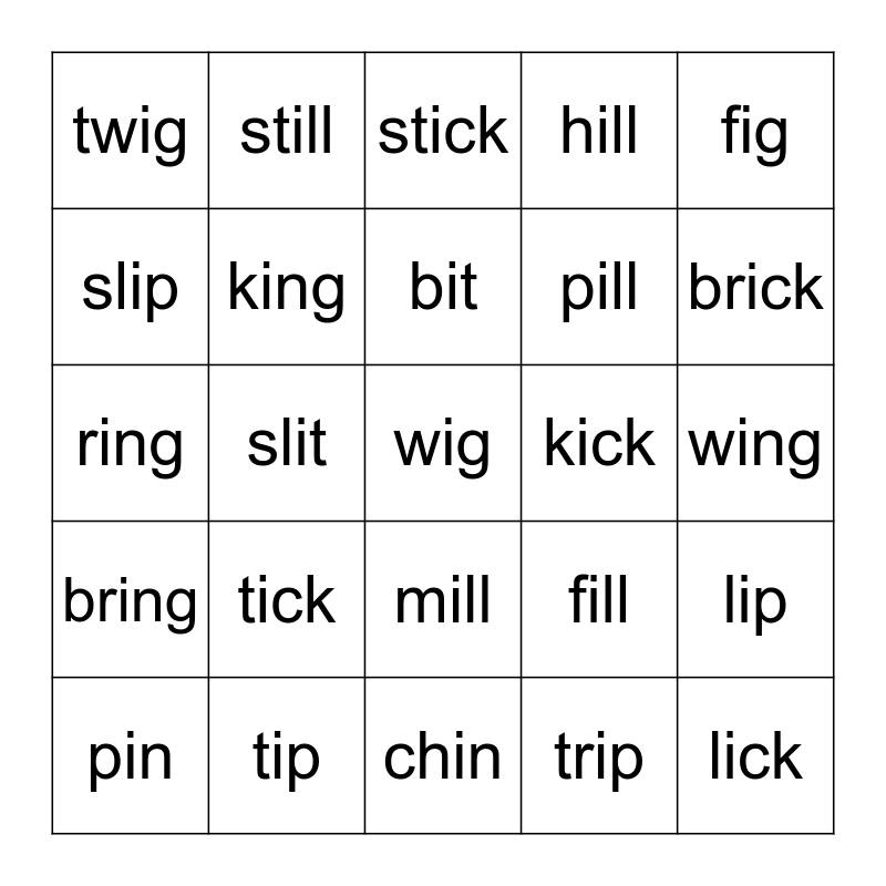This bingo card has 30 words: pin, win, bit, lit, fig, twig, still, mill, kick, lick, bring, king, drill, trip, lip, twin, slit, wig, fill, brick, ring, tip, stick, pill, wing, slip, tick, chin, hill and spill.