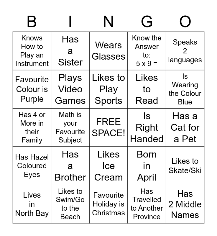This bingo card has a free space and 24 words: Has a Brother, Likes to Swim/Go to the Beach, Likes to Play Sports, Lives in North Bay, Speaks 2 languages, Knows How to Play an Instrument, Favourite Colour is Purple, Has a Sister, Is Right Handed, Likes Ice Cream, Likes to Read, Has 4 or More in their Family, Born in April, Likes to Skate/Ski, Plays Video Games, Has Travelled to Another Province, Has a Cat for a Pet, Wears Glasses, Is Wearing the Colour Blue, Math is your Favourite Subject, Has 2 Middle Names, Has Hazel Coloured Eyes, Know the Answer to: 5 x 9 = and Favourite Holiday is Christmas.