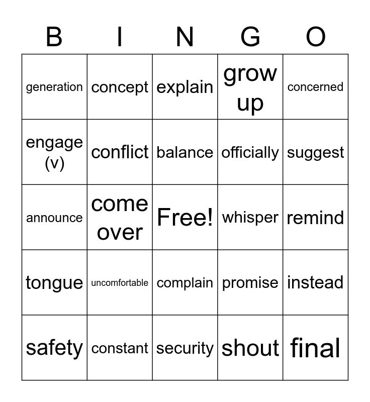 This bingo card has a free space and 24 words: uncomfortable, constant, balance, safety, concerned, generation, engage (v), concept, whisper, complain, officially, announce, promise, instead, conflict, shout, remind, explain, suggest, come over, final, tongue, grow up and security.