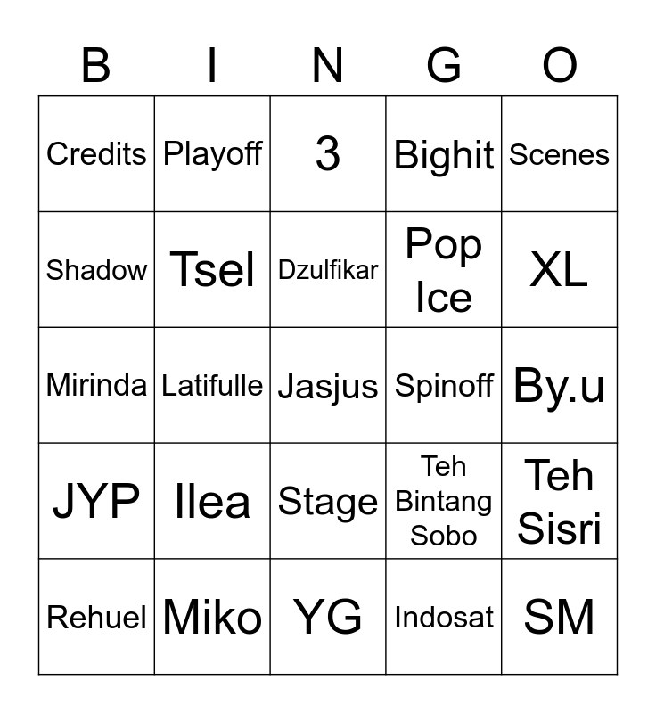 This bingo card has a free space and 24 words: Ilea, Miko, Dzulfikar, Rehuel, Scenes, Credits, Shadow, Playoff, Spinoff, Stage, Pop Ice, Mirinda, Teh Bintang Sobo, Teh Sisri, Tsel, Indosat, By.u, 3, XL, Latifulle, SM, JYP, Bighit and YG.
