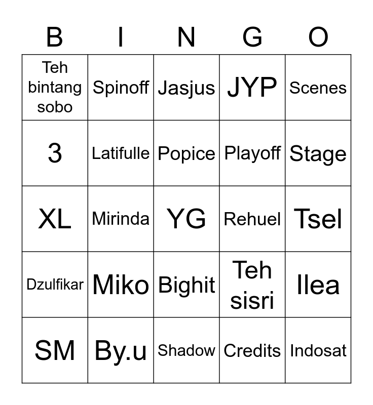 This bingo card has a free space and 24 words: Miko, By.u, Popice, SM, Scenes, Teh bintang sobo, 3, Spinoff, Rehuel, Bighit, Playoff, XL, Teh sisri, Ilea, Latifulle, Credits, Tsel, Jasjus, Stage, Mirinda, Indosat, Dzulfikar, JYP and Shadow.