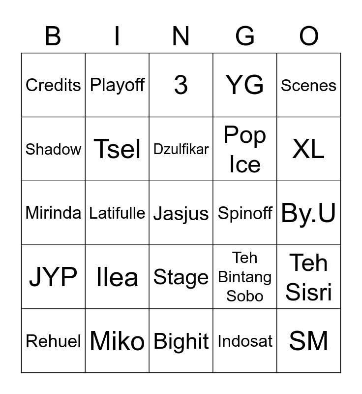 This bingo card has a free space and 24 words: Ilea, Miko, Dzulfikar, Rehuel, Scenes, Credits, Shadow, Playoff, Spinoff, Stage, Pop Ice, Mirinda, Teh Bintang Sobo, Teh Sisri, Tsel, Indosat, By.U, 3, XL, Latifulle, SM, JYP, YG and Bighit.